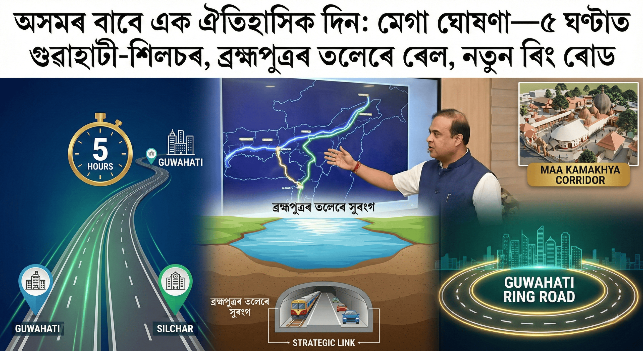 আজিৰ দিনটো অসমৰ বিকাশৰ ইতিহাসত সোণালী আখৰেৰে লিখা থাকিব। মুখ্যমন্ত্ৰী ড° হিমন্ত বিশ্ব শৰ্মাই আজি এক সংবাদমেলত যিবোৰ ঘোষণা কৰিলে, সেয়া কেৱল প্ৰতিশ্ৰুতি নহয়, এখন ‘নতুন আৰু শক্তিশালী অসম’ৰ মানচিত্ৰ। যোগাযোগৰ পৰা আৰম্ভ কৰি ৰাষ্ট্ৰীয় নিৰাপত্তালৈকে— চৰকাৰে গ্ৰহণ কৰিছে কেবাটাও যুগান্তকাৰী পদক্ষেপ।